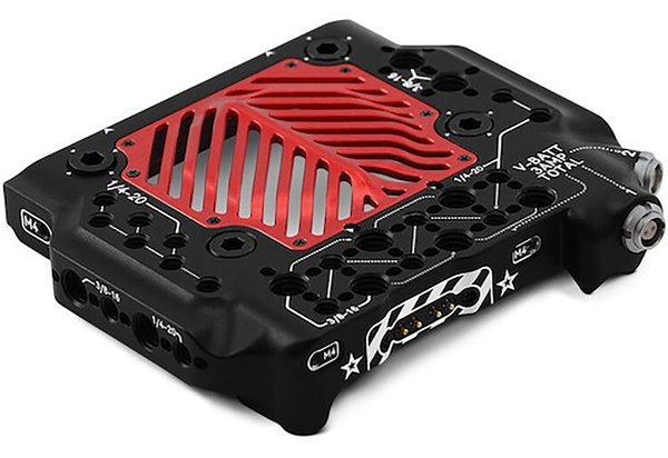 The RED V-RAPTOR Tactical Top Plate w/ Gold Mount Adapter Plus secures to the back of a V-RAPTOR brain to provide Gold Mount power to the camera and select DSMC3 accessories. Key features include: